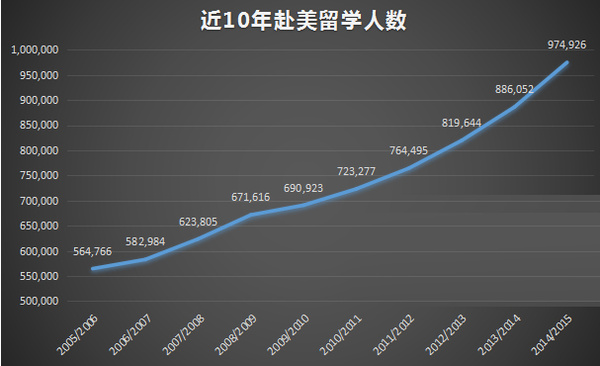 《2015美国门户开放报告》显示,2014-2015学年留美人数再创新高,达到974926人,比上一学年增长10%,创35年来最高年度增幅。2014-2015学年,国际生占美国高等教育学生总数的4.8%。