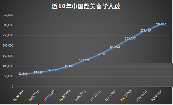 2014-2015学年,赴美留学中国学生人数总计304040万人,较上一学年增长10.8%,中国继续名列美国最大的留学生来源国。留美人数最多的三个国家是:中国(304040人,占比31.2%)、印度(132888人,占比13.6%)、韩国(63710人,占比6.5%)。