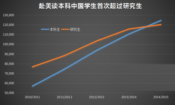 赴美攻读本科学位的中国学生人数第一次超过了赴美攻读研究生学位的人数,2014-2015学年,赴美留学读本科的中国学生达124552人,较前一年增长12.7%,赴美读研究生的中国学生达120331人,较前一年增长了4%。