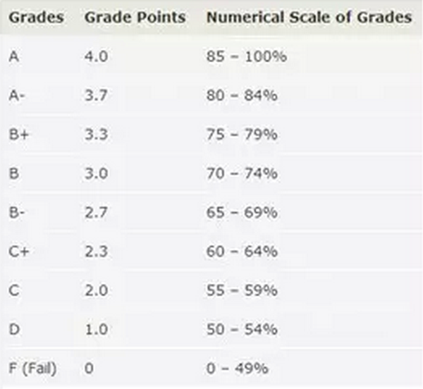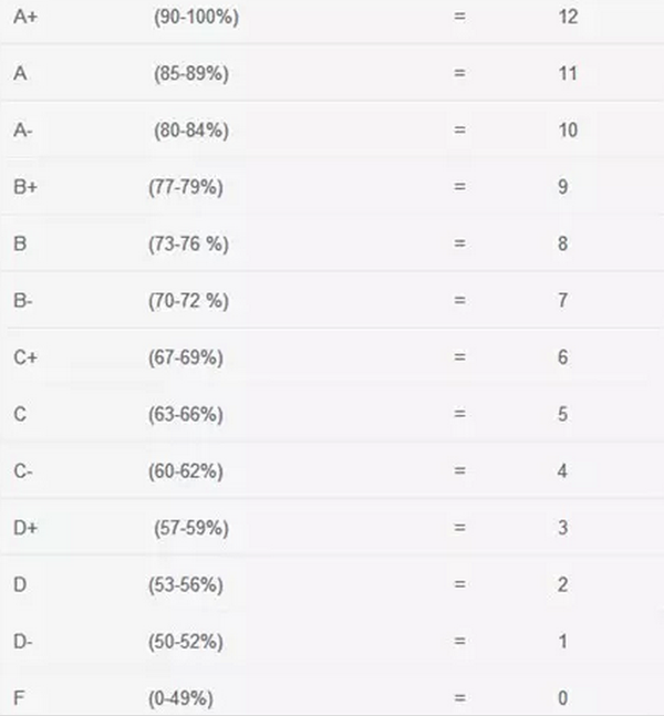 加拿大硕士阶段申请,不同的学校用的分数体制不一样,一般是4分制、4.33分制、12分制及A-C等级制,那么这些分数制跟中国的百分制是如何对应的呢?首先来看一下典型的分数制标准