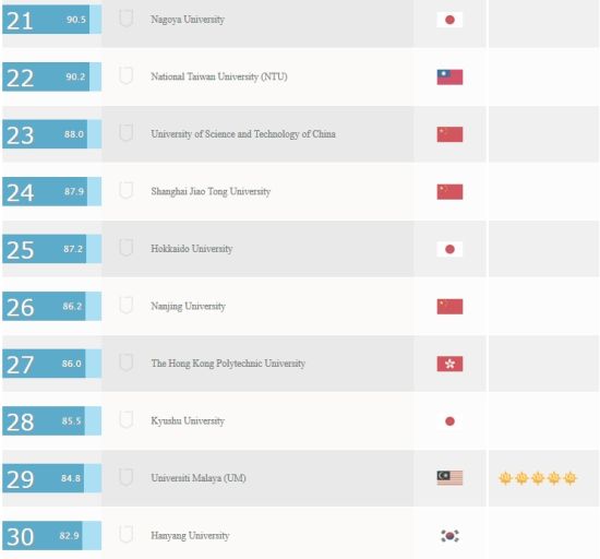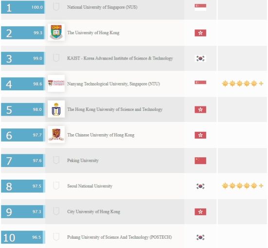 51due海外文书平台介绍,2015年亚洲最佳大学前10名依序为:新加坡国立大学,香港大学,韩国科学技术院(KAIST),南洋理工大学,香港科技大学,香港中文大学,北京大学,首尔大学,香港城市大学,浦项工科大学(POSTECH)。下面以图表的形式展示亚洲大学排名前30。