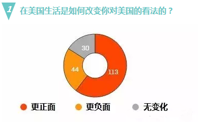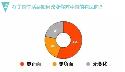 接受访问的人中,超过六成的人表示,在美国留学让他们对美国的看法更正面,23%的人表示更负面,其他的人表示没有变化。从表面来看,这些数据可能暗示这些学生对美国价值观的肯定。55%的受访者表示,他们在美国生活一段时间后对中国的看法有所改善,22%的人表示他们对祖国的印象变差。中国的大学可能在很努力地达到国际认可,但是美式教育目前仍是最吸引中国学生海外留学的地方。
