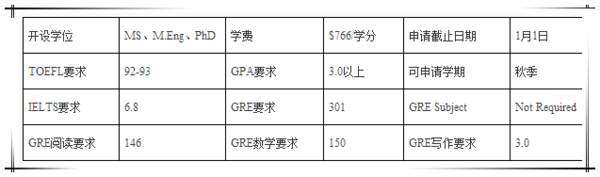 录取要求:需要提交:GRE成绩、TOEFL成绩(iBT最低要求90分,听、说、读、写成绩分别不低于14、18、19、18分)或IELTS成绩(最低要求6.5分)。